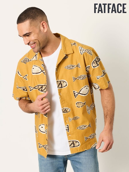 FatFace Dark Yellow Short Sleeve Relaxed Fit Fish Print Shirt