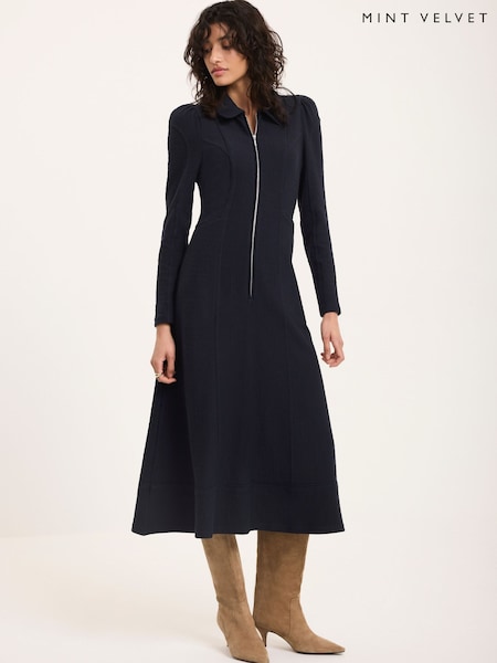 Mint Velvet Blue Textured Zip Detail Midi Dress