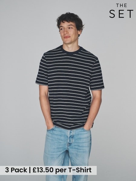 The Set 3 Pack Navy Blue/Light Brown Cotton Textured Crew Neck T-Shirts Navy/Stone
