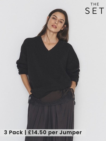 The Set 3 Pack 4 Pack Fine Knit V-Neck Jumpers Black/Chocolate Brown/Stone