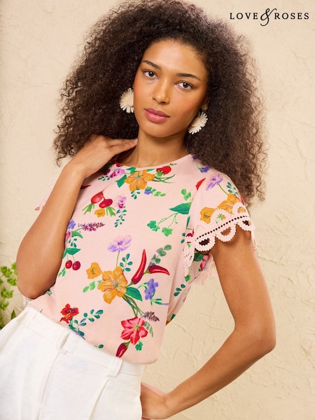Love & Roses Pink Floral Chilli Print Flutter Sleeve Jersey T-Shirt