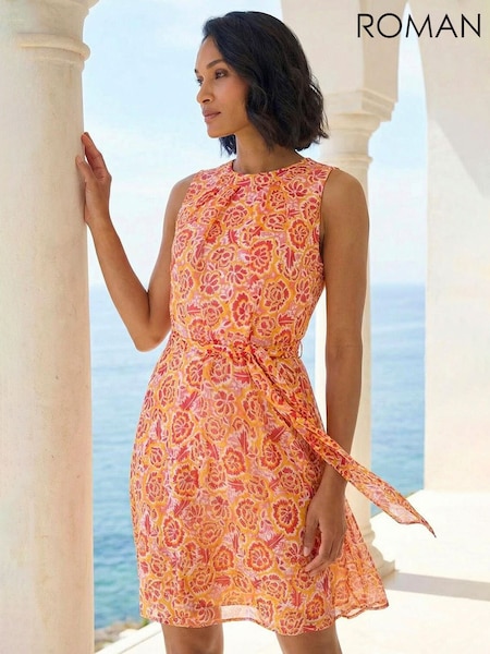 Roman Orange Leaf Print Lace Detail Smock Dress