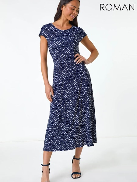 Roman Blue Petite Spot Print Crinkle Midi Dress