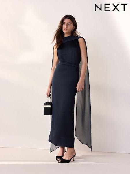 Navy Blue Tabitha Simmons Scarf Detail Satin Occasion Dress
