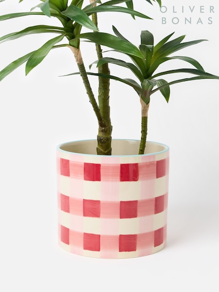 Oliver Bonas Red Pink Gingham Ceramic Plant Pot