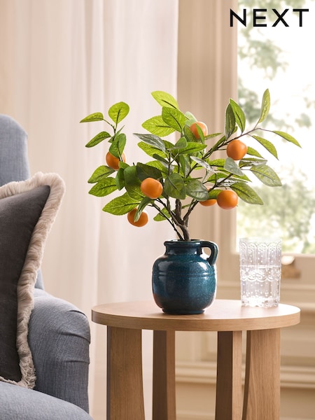 Green Artificial Orange Tree in Blue Reactive Ceramic Pot