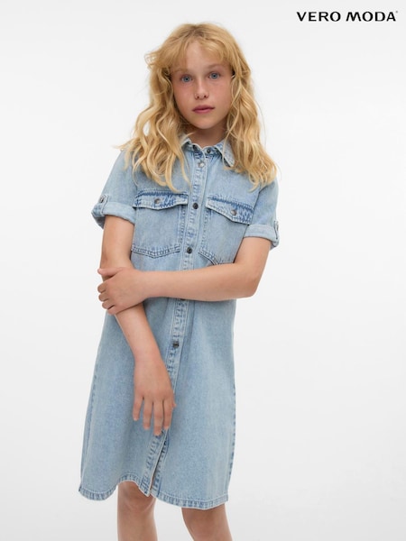 VERO MODA Blue Girl Short Sleeve Button Down Denim Dress