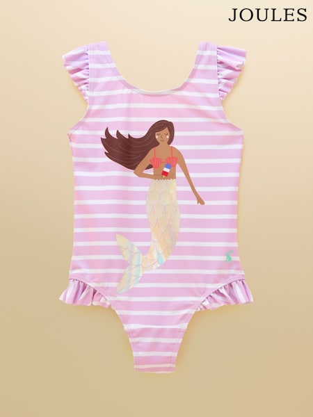 Joules Girls' Splash White & Lilac Striped Mermaid Swimming Costume