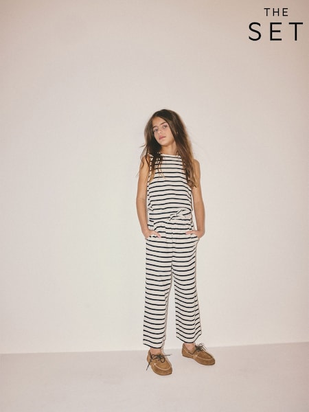 The Set Textured Jersey Sleeveless Bubble Top and Wide Leg Trousers Set Ecru/Navy Stripe
