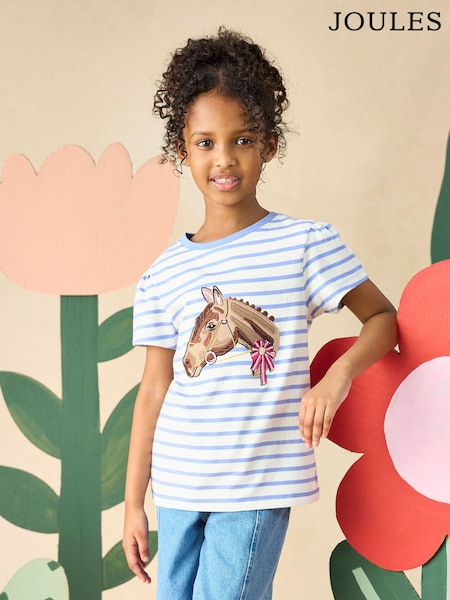 Joules Girls' Astra White & Blue Striped Horse Applique Cotton T-Shirt