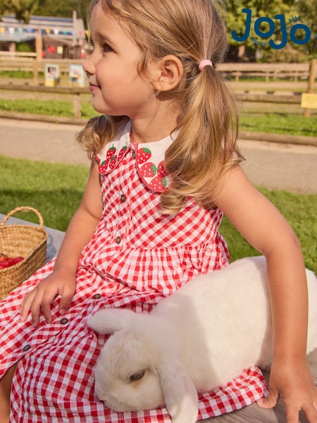 JoJo Maman Bébé Pink Gingham Strawberry Embroidered Frill Sleeve Dress