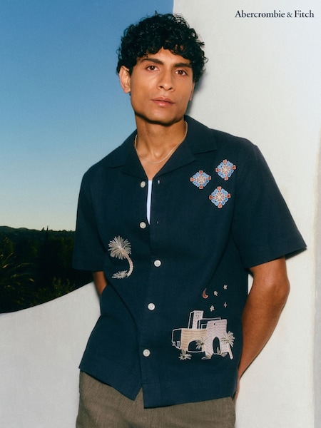 Abercrombie & Fitch Navy Ramadan Woven Short Sleeve Collared Shirt