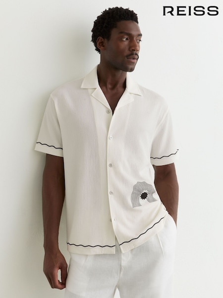 Reiss White Solano Textured Motif-Print Cuban-Collar Shirt