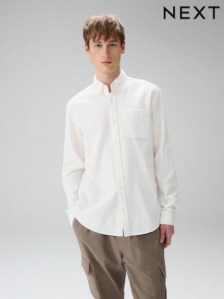 White Standard Collar Cotton Linen Blend Long Sleeve Shirt