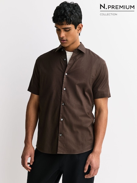 Dark Brown Regular Fit N. Premium Cotton Linen Blend Short Sleeve Smart Shirt