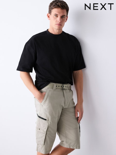 Stone Long Length Belted Cargo Shorts