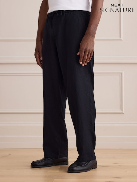 Black Relaxed Fit Signature 100% Linen Trousers With Elasticated Waist