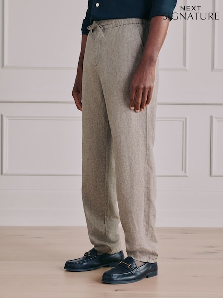 Mushroom Regular Tapered Fit Signature Linen Trousers With Elasticated Waist