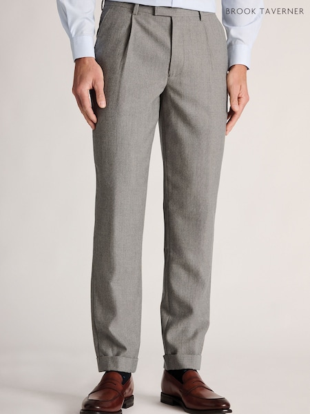 Brook Taverner Grey Tapered Pleat Front Turn Up Wool Trousers