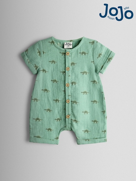 JoJo Maman Bébé Khaki Green Dino Printed Cheesecloth Romper