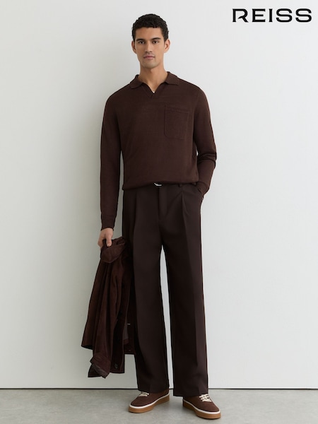 Reiss Chocolate Brown Oaklands Linen Open-Collar Regular-Fit Polo Shirt