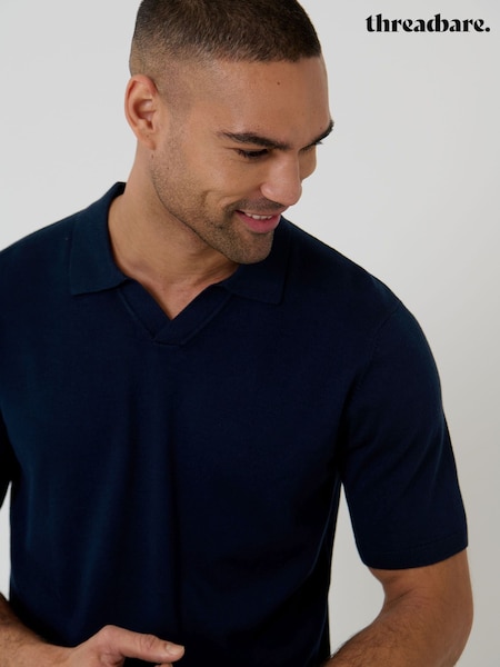 Threadbare Navy Blue Knitted Trophy Neck Polo Shirt