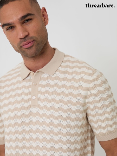 Threadbare Natural Wavy Stripe Textured Knitted Polo Shirt