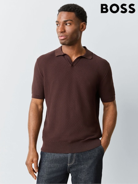 BOSS Brown Natalo Regular Fit Trophy Neck Knitted Polo Shirt