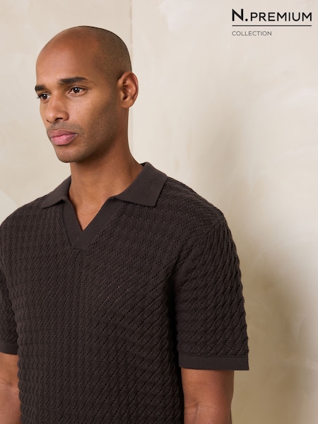 Truffle Brown Regular Fit Cotton Rich Pointelle Knit Polo Shirt