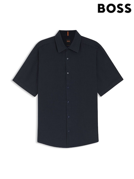 BOSS Navy Regular Fit Short Sleeve Linen Shirt