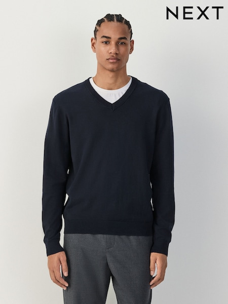 Navy Blue V-Neck Regular Fit Cotton Rich Jumper