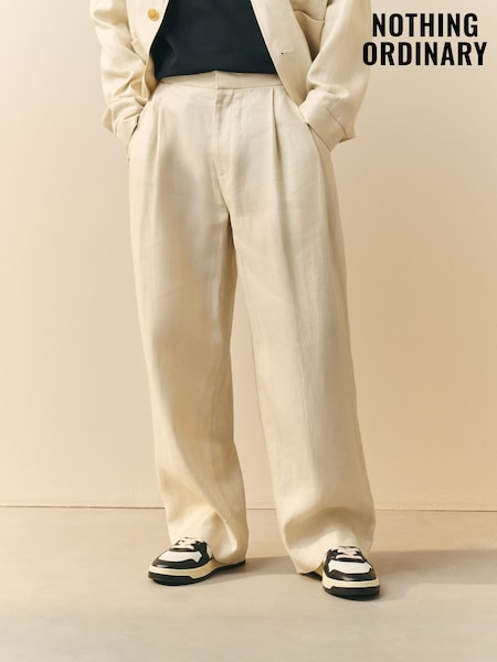 Nothing Ordinary Natural Pure Linen Herringbone Pleated Relaxed Fit Trousers