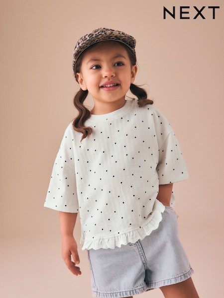 Ecru White Mono Spot Short Sleeve Frill Hem Top (3mths-7yrs)
