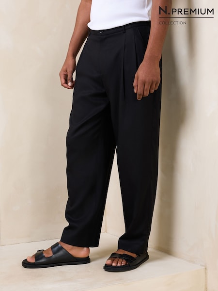 Black N.Premium Lyocell-Linen Blend Relaxed fit Smart Trousers with Elasticated Waistband