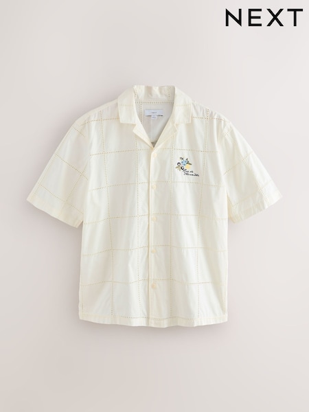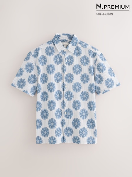 Blue Flower Textured Embroidered Short Sleeve Shirt
