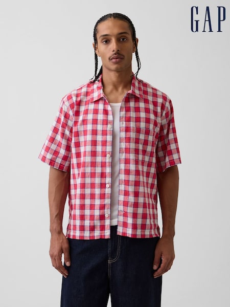 Gap Red Check Linen-Cotton Relaxed Straight-Hem Short Sleeve Shirt