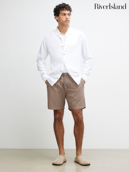 Tan Brown Textured Cotton Linen Blend Drawstring Shorts