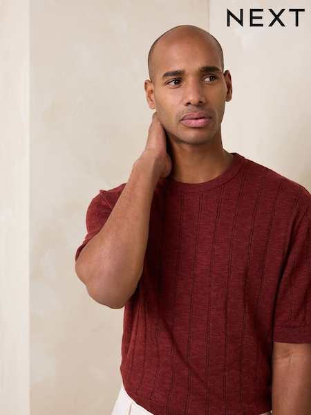 Red Regular Fit Pointelle Knitted T-Shirt with Linen