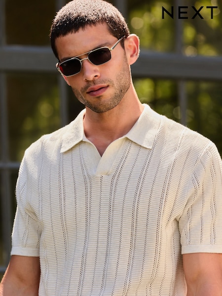 Neutral Regular Fit Textured Knit Short Sleeve Trophy Neck Polo Shirt