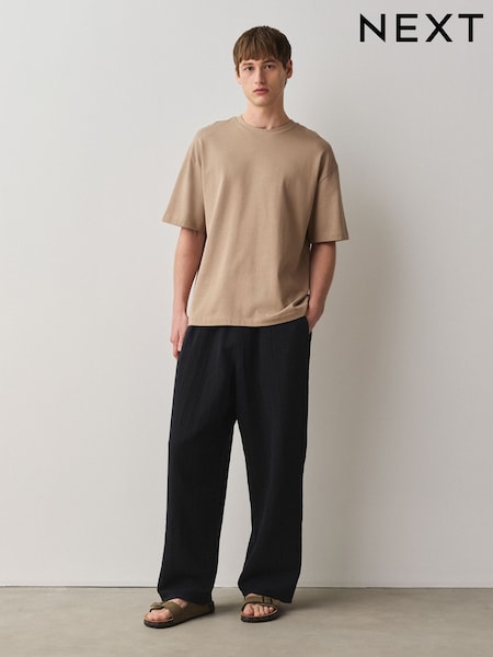 Black Honeycomb Baggy Fit 100% Cotton Trousers With Elasticated Waist