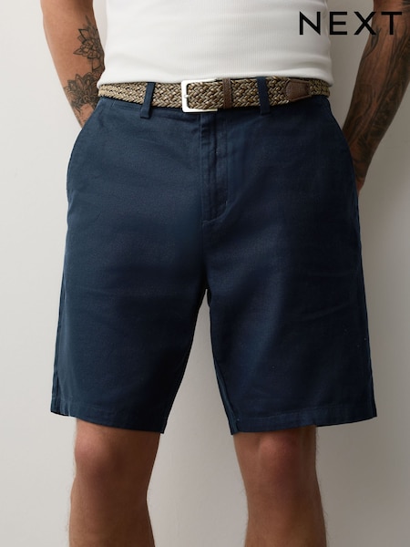 Navy Belted Cotton Linen Blend Shorts
