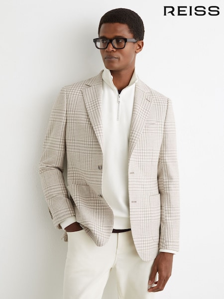 Reiss Soft Grey Bardo Cotton and Wool Single-Breasted Blazer Classic-Fit in Check