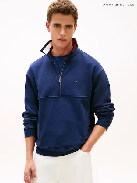 Tommy Hilfiger Blue Colour-Blocked Collar Terry Half Zip Jumper