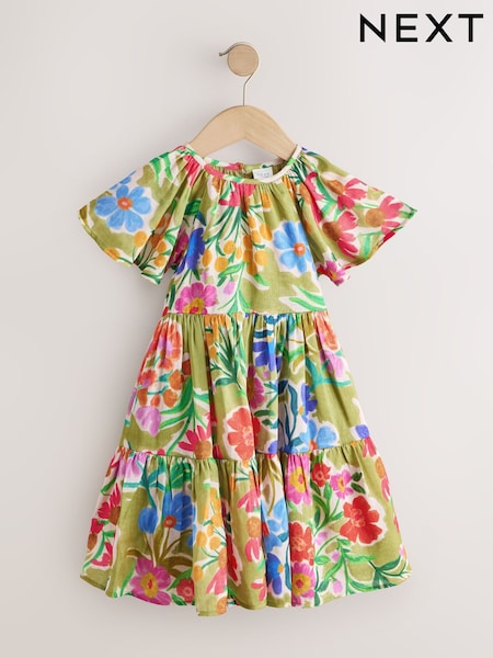Green Floral Angel Sleeve Dress (3-16yrs)