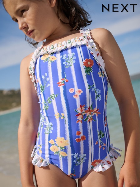 Blue Floral Stripe Ruffle Swimsuit (3-16yrs)