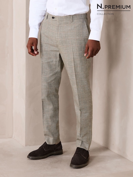 Neutral Regular Fit Linen Blend Check Suit Trousers