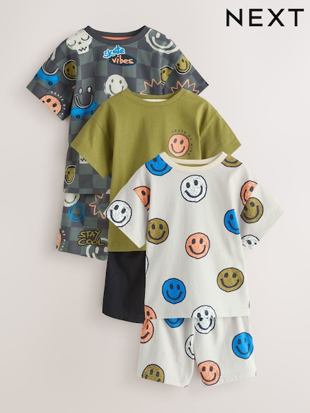 Black/Green/Stone Happy Face Short Pyjamas Happy Face 3 Pack (9mths-12yrs)