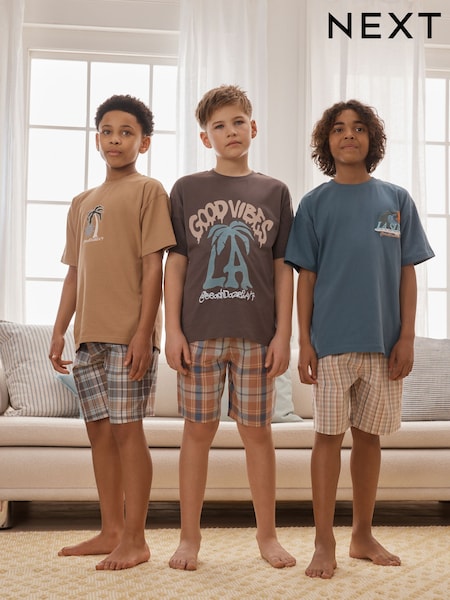Grey/Stone/Blue Check 3 Pack Short Pyjamas (3-16yrs)