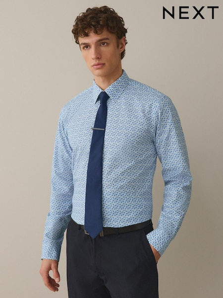 Ditsy/Navy Blue Regular Fit Cotton Floral Printed Shirt Tie and Tie Clip Set