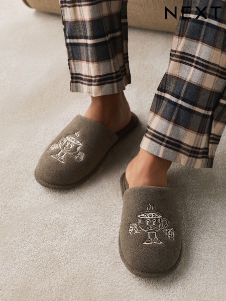 Taupe Brown Coffee Embroidered Towelling Slipper Sliders